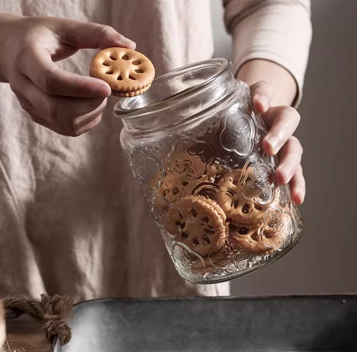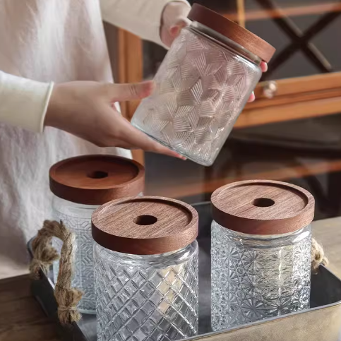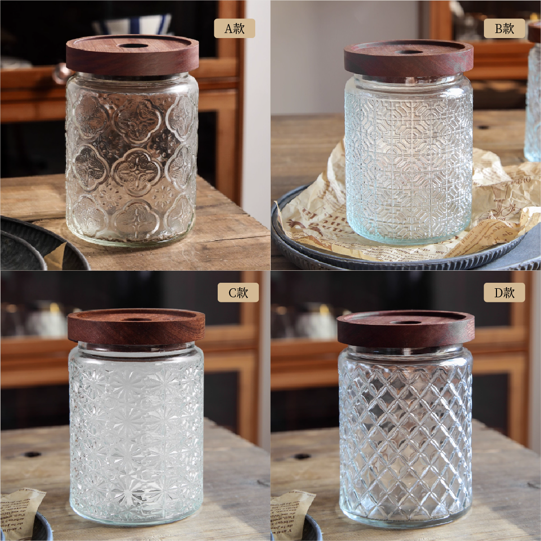 壓紋玻璃搭配原木蓋,營造出復古花園般的浪漫氛圍,適合收納茶葉、咖啡豆、糖果或乾貨,兼具美觀與實用,為廚房與餐桌增添質感。