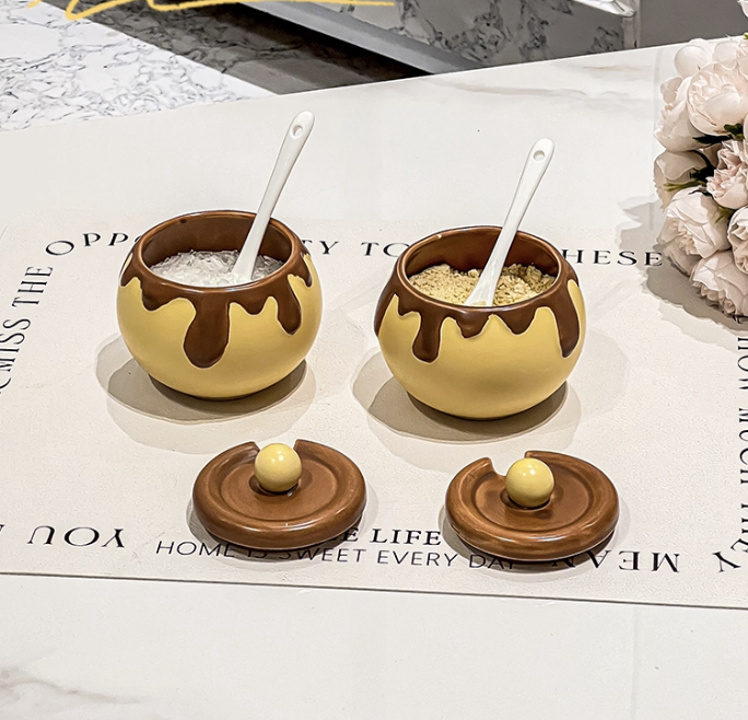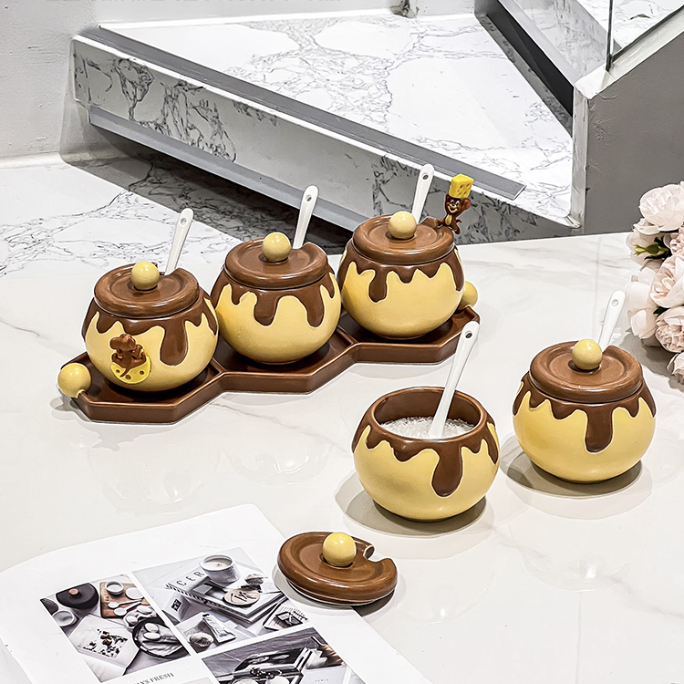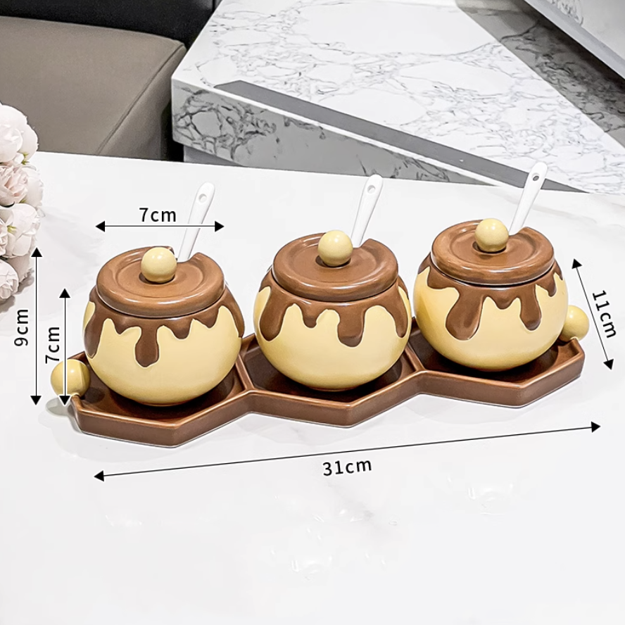 蜂蜜罐造型設計,陶瓷材質細膩溫潤,附專屬小湯匙,多格分隔便於分類鹽、糖、胡椒等調味料,可愛又實用,不僅點綴廚房美感,也讓料理調味井然有序。