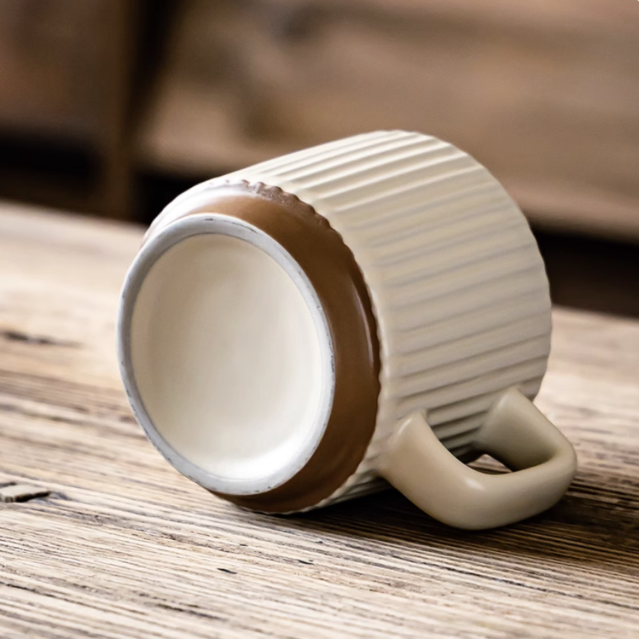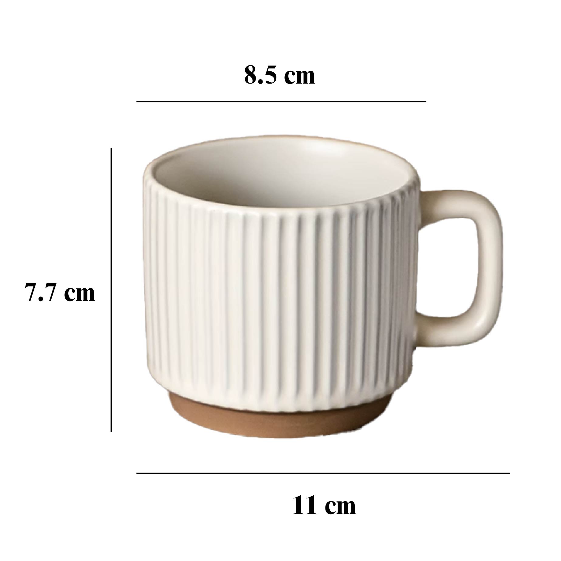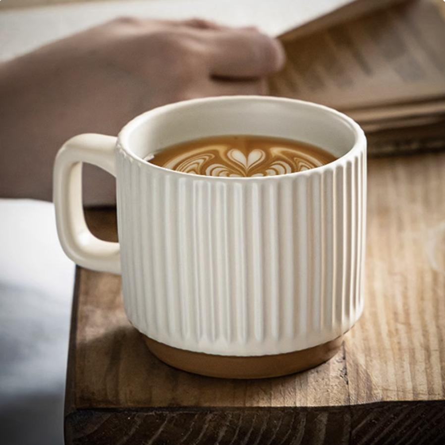 立體直條紋理設計,勾勒俐落簡約的現代質感,底部自然陶土拼接細膩白瓷,呈現溫潤手感,容量適中,適合享用咖啡、牛奶或熱茶,是日常餐桌與閱讀時光的高顏值實用杯具。