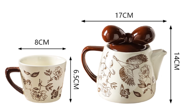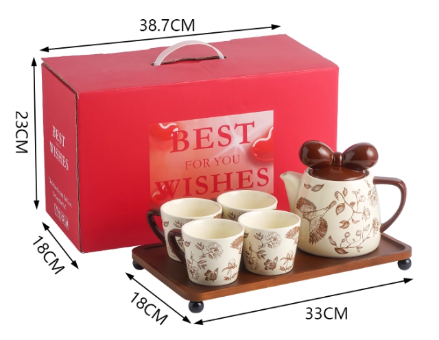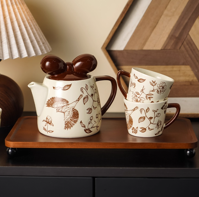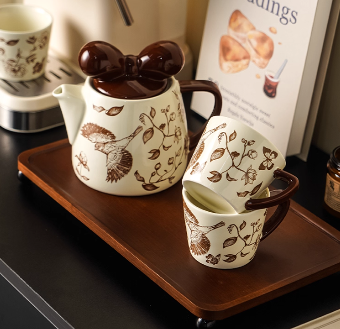 帶有自然花卉圖案的陶瓷茶壺與茶杯,搭配實木色托盤,不論是送禮還是日常自用都非常合適,讓品茶時光更添溫度與美感。